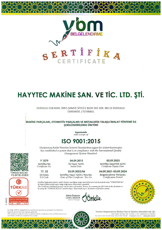 HAYYTEC Makine olarak; firmamızı başarılı bir şekilde yönetmek, kontrol etmek, sistematik ve şeffaf çalışabilmek için uluslararası bir standart olan ISO 9001:2015 Kalite Yönetim Sistemine sahibiz.